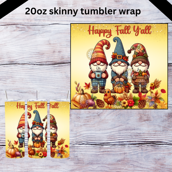 20oz Skinny straight tumbler wrap png, Happy Fall Y’all design png download, Thanksgiving gnomes, cute Thanksgiving png download