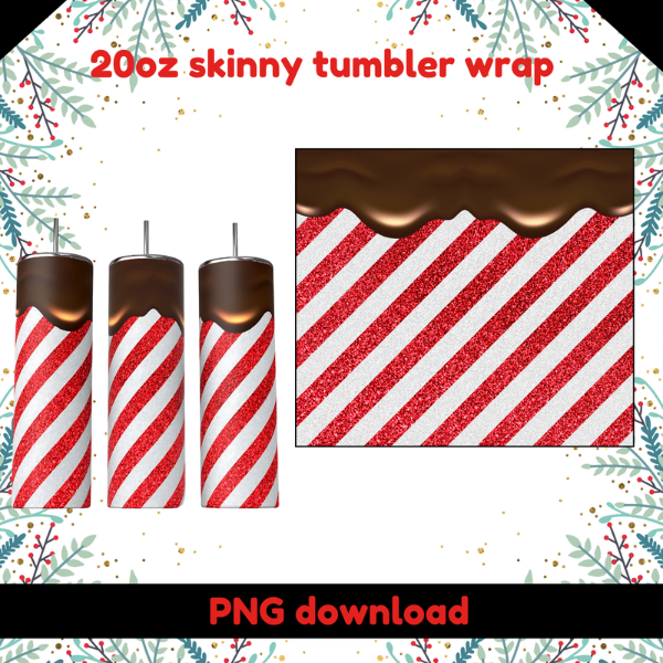 20oz skinny straight tumbler wrap, chocolate drip with glitter candy cane stripes, Christmas tumbler png, tumbler wrap png download
