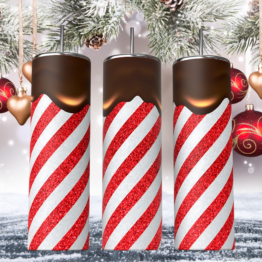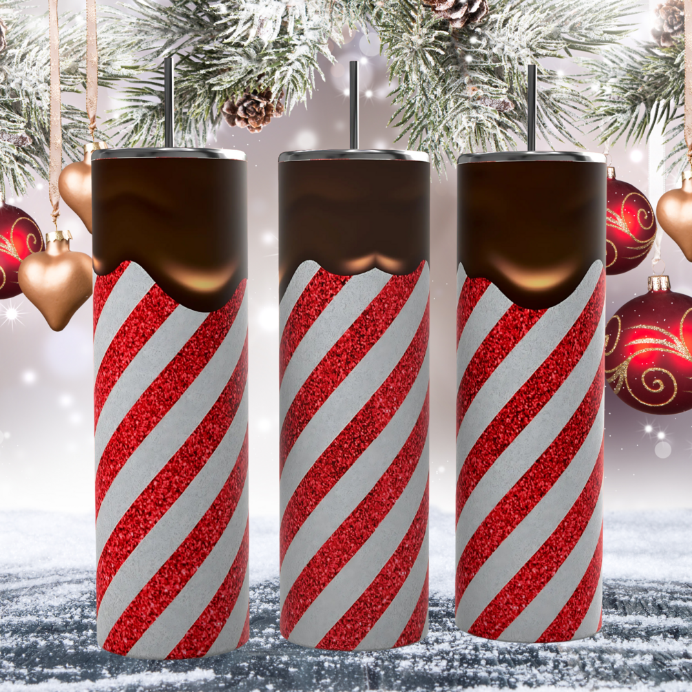 20oz skinny straight tumbler wrap, chocolate drip with glitter candy cane stripes, png download, Christmas tumbler png, tumbler wrap png download
