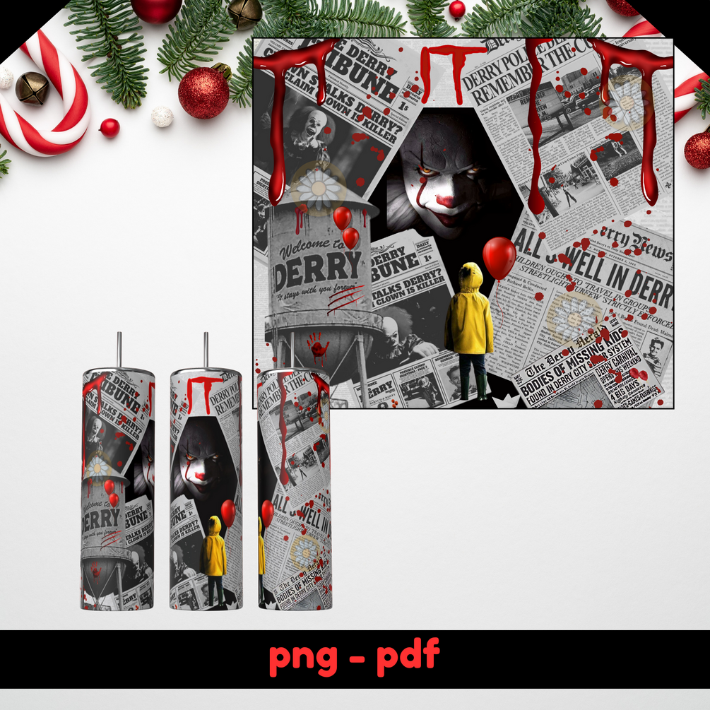IT, Welcome to Derry! Pennywise Halloween 20oz Skinny straight tumbler wrap design PNG download.